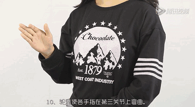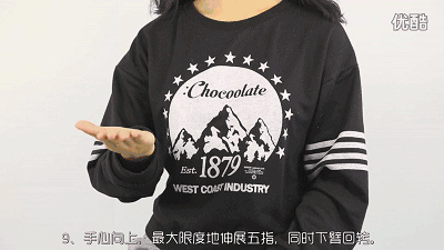 9、手心向上,最大限度地伸展五指,同时下臂回转。