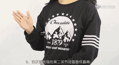 8、左手手心向内,右手手心向下,右手中指轻轻接触左手手心。